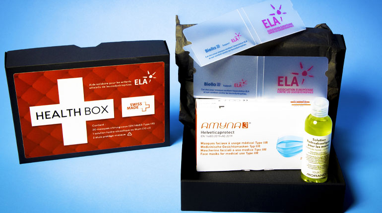 Le coffret solidaire HEALTH BOX SWISS MADE, créé par ELA Suisse, contient 20 masques chirurgicaux, 1 solution hydroalcoolique et 2 étuis protège-masques. Pour réaliser ce kit sanitaire, ELA Suisse s’est entourée de trois entreprises helvétiques sensibles à la cause d’ELA : la Distillerie Louis Morand & Cie pour la solution hydroalcoolique, Amyna3 pour les masques chirurgicaux et Biella Suisse pour les protège-masques. Ces entreprises de renom ont conçu et développé des produits de haute qualité, estampillés Swiss Made, répondant à toutes les normes de certification.